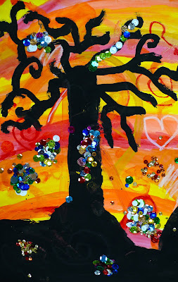 Lastly, the students had the option to add sequins to their paintings to represent leaves. Students displayed sparse leaves dangling on a branch, swirling leaves in the wind, and a heaping pile of leaves waiting to be jumped in!